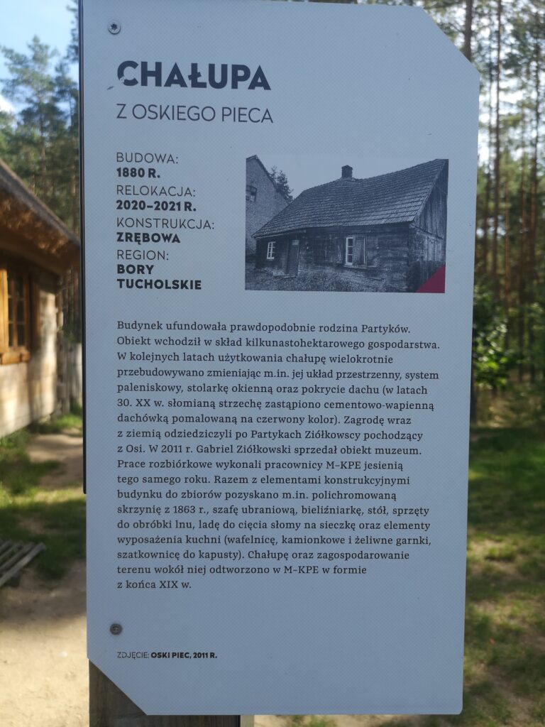 Przy jednym z krańcowych obiektów umieszczonych niedaleko płotu oddzielającego skansen od sąsiadów możemy znaleźć tablicę o współczesnych domach (lub domu – już nie pamiętam). O tym, kiedy zostały zbudowane, o architekturze, o dominujących w danym czasie stylu. Co pokazuje, że kaszubska, tucholska i kociewska wieś nadal żyje, powstają inne domy, z innych materiałów, mieszają się style (i budowania i życia). Ale też przypomina nam, że to, co dzisiaj jest obiektem w skansenie czy innym muzeum, kiedyś służyło ludziom, było ich codziennością, ich „tu i teraz”. A to, czym my się dzisiaj otaczamy, w jakich domach żyjemy, jak wygląda nasza praca, kiedyś będzie odległą historią…